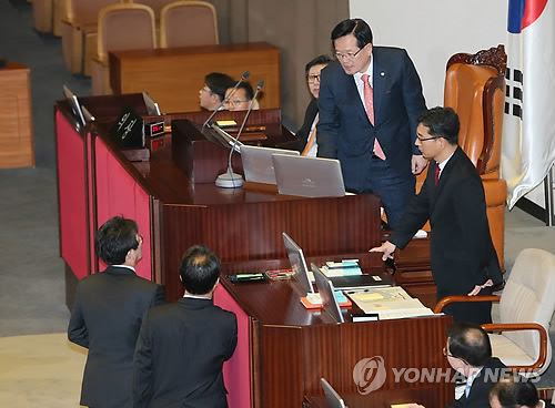 | △ (서울=연합뉴스) 정의화 국회의장(오른쪽)이 16일 국회 본회의장에서 '이완구 총리 후보자 임명동의안' 투표를 앞두고 새누리당 유승민 원내대표, 조해진 원내수석부대표와 논의하고 있다. |