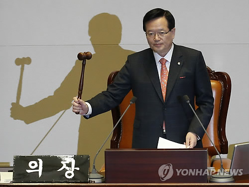 | △ (서울=연합뉴스) 정의화 국회의장이 16일 국회에서 열린 제331회 국회 (임시회) 제4차 본회의에서 이완구 국무총리 후보자 임명동의안 가결을 발표한 뒤 의사봉을 두드리고 있다. |