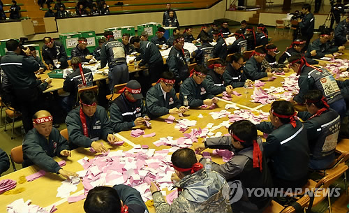 | △ 현대중 노조, 임단협 2차 합의안 찬반투표 개표 (울산=연합뉴스) 김용태 기자 = 현대중공업 노조가 16일 오후 울산 현대중공업 본사에서 2014년 임단협 2차 합의안 찬반투표 개표를 하고 있다. 2015.2.16 yongtae@yna.co.kr |