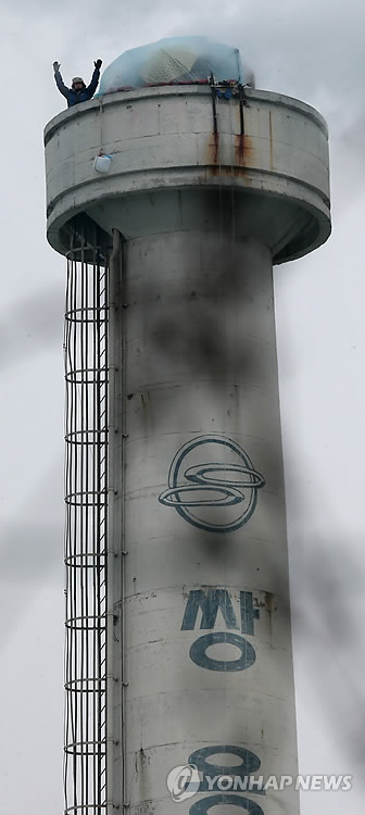 | △ 60m 굴뚝에서 설 맞이하는 쌍용차 해고노동자 (평택=연합뉴스) 신영근 기자 = 설 연휴를 하루 앞둔 17일 오전 경기도 평택 쌍용자동차 평택공장 70m 높이 굴뚝에서 해고자 복직 문제 해결을 위해 고공 농성중인 금속노조 쌍용차지부 김정욱 사무국장이 공장 밖 동료에게 손을 흔들고 있다. 김 국장과 함께 농성중인 이창근 정책기획실장 등은 오는 19일 퇴거 단행을 앞두고 해고자 문제 해결 없이는 굴뚝 아래로 내려오는 일은 없을 것이라고 밝혔다. 2015.2.17 drops@yna.co.kr http://blog.yonhapnews.co.kr/geenang |