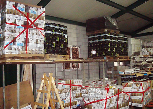 | △ 인터폴과 유로폴이 지난해 47개국에서 저질 식료품 약 2천500톤, 물 탄 술 27만5천여리터를 압수했다. 사진은 값산 싸구려 와인을 미국산으로 둔갑시킨 와인상자들.(연합뉴스 자료사진) |