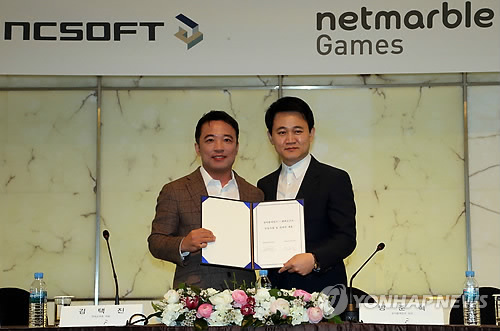 | △ 전략적 제휴, 엔씨소프트-넷마블게임즈 (서울=연합뉴스) 최재구 기자 = 김택진 엔씨소프트 대표(왼쪽)과 방준혁 넷마블게임즈 의장이 17일 서울 중구 플라자호텔에서 열린 공동사업 및 전략적 제휴식에서 협약서를 들어보이고 있다. |