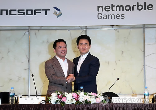| △ 엔씨소프트-넷마블게임즈 전략적 제휴 (서울=연합뉴스) 최재구 기자 = 김택진 엔씨소프트 대표(왼쪽)와 방준혁 넷마블게임즈 의장이 17일 서울 중구 플라자호텔에서 열린 공동사업 및 전략적 제휴식에서 손을 맞잡고 있다. |