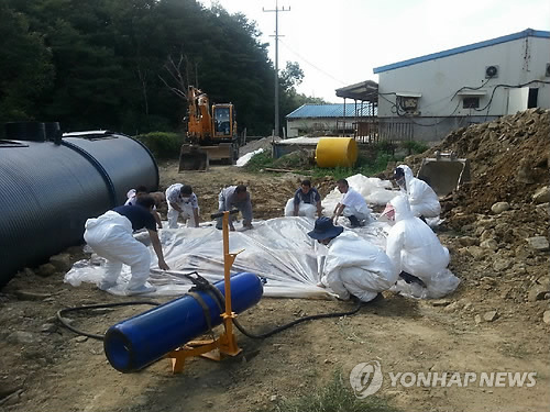 | △ 구제역이 발생한 한 돼지농장 인근에서 인부와 공무원들이 구제역에 감염된 돼지를 살처분하고 있다. (독자 제공 연합뉴스 자료사진) |