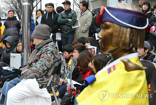 | △ (서울=연합뉴스) 황광모 기자 = 설 연휴 첫 날인 18일 오후 서울 중학동 일본대사관 앞에서 열린 제1166차 일본군 '위안부' 문제해결을 위한 정기 수요시위에서 집회가 열렸다. 이날 집회에 참석한 김복동, 길원옥 할머니가 한복을 곱게 차려입은 위안부 소녀상과 나란히 앉아 있다. 2015.2.18 hkmpooh@yna.co.kr |
