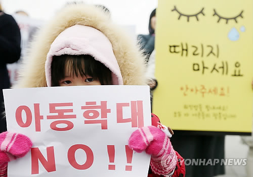 | △ '아동학대 NO!' (인천=연합뉴스) 윤태현 기자 = 인천 어린이집 아동학대 사건의 파문이 커진 가운데 인천시 연수구 송도 센트럴공원에서 한 여아가 어린이집 아동학대 근절을 촉구하는 피켓을 들고 있다. (연합뉴스 자료사진) |