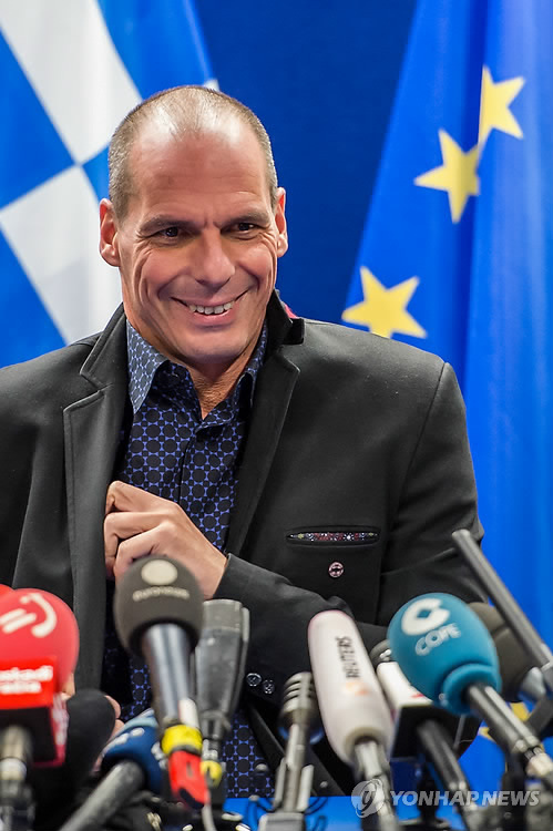 | △ (AP=연합뉴스) 야니스 바루파키스 그리스 재무장관이 16일(현지시간) 벨기에 브뤼셀에서 그리스 구제금융 협상을 위한 유로그룹(유로화 사용 19개국 재무장관 협의체) 회의가 끝난 후 기자회견을 통해 그리스와 채권단이 이틀 안에 합의를 도출할 수 있을 것이라고 말하고 있다. 유로그룹은 현행 구제금융 프로그램 연장과 그리스 새 정부의 개혁 계획 등을 논의했으나 이견을 좁히지 못해 이날 결론을 내리지 못했으며 그리스가 구제금융 연장을 요청하면 20일 회의를 재개해 다시 논의키로 했다. |