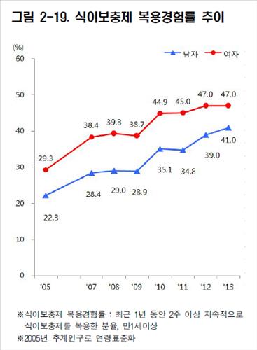 20일 질병관리본부의 '2013 국민건강영양조사'에 따르면 1세 이상 성인 남녀 중 44.0%가 최근 1년 동안 2주 이상 지속적으로 식이보충제를 복용했다고 응답했다.