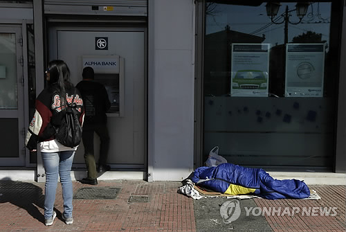 | △ 그리스 정부와 유로그룹이 구제금융 지원 6개월 연장안을 놓고 막판 줄다리기를 계속하고 있다. 사진은 지난 19일 그리스 수도 아테네의 한 은행 현금인출기(ATM) 앞 풍경. 누워 있는 노숙자와 돈을 찾고 있는 사람의 모습이 대비된다. (AP=연합뉴스) |