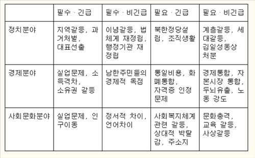 우선 정치분야에서는 통일 후 북한의 지역개발 우선순위 차이에 따른 지역갈등과 과거 지배 계층에 대한 처벌 문제, 북한 지역에서의 대표선출 등 3가지가 필수적이고 긴급한 우선순위로 분석됐다.