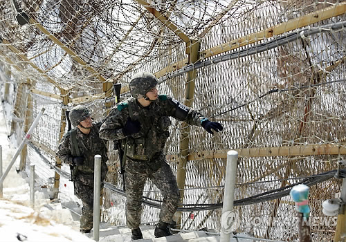| △ 전역 앞둔 원사, 아들과 마지막 GOP 동반근무 (서울=연합뉴스) 33년간의 군 생활을 마무리하며 전역을 앞둔 육군 김종환 원사가 지난 19일 아들 김은수 하사와 함께 15사단 GOP 동반근무를 하며 철책점검을 하고 있다. 2015.2.21 << 육군제공 >> jjaeck9@yna.co.kr |
