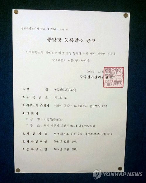 | △ 선관위, 해산결정 통진당 정당등록 말소 (서울=연합뉴스) 중앙선거관리위원회는 19일 헌법재판소에서 통합진보당 해산 결정 통지문을 전달해옴에 따라 통진당의 정당 등록을 말소했다고 밝혔다. 사진은 이날 선관위 게시판에 공고된 통합진보당 등록말소 공고문. 2014.12.19 <<중앙선거관리위원회 제공>> zjin@yna.co.kr |