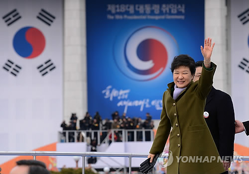 | △ 박근혜 대통령이 2013년 2월 25일 국회에서 열린 제18대 대통령 취임식에서 시민들에게 손을 흔들고 있다. |