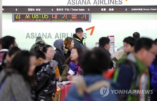 | △ '대기불가' 귀경길 (제주=연합뉴스) 김호천 기자 = 설 연휴 마지막 날인 22일 제주공항 출발 항공편 예약률이 100%를 기록, 수백명이 표를 구하지 못해 발을 굴렀다. 아시아나항공 발권 카운터의 '대기불가'란 문구가 탑승권이 바닥났음을 알리고 있다. 2015.2.22 khc@yna.co.kr |