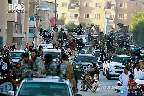 | △ IS, 야지디 여성 수천명 '성노예' (AP=연합뉴스) IS 반군이 시리아 북부 락까에서 차량을 동원해 시가행렬을 벌이는 모습. 지난해 6월30일 IS 락까 공보센터가 공개한 영상. In this undated file image posted on Monday, June 30, 2014, by the Raqqa Media Center of the Islamic State group, a Syrian opposition group, which has been verified and is consistent with other AP reporting, fighters from the Islamic State group parade in Raqqa, north Syria. Hundreds of women have been captured by the group, enslaved and sold, many have been subjected to sexual violence and others have been stoned for adultery. (AP Photo/Raqqa Media Center of the Islamic State group, File) |