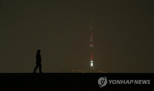 | △ 황사경보가 내려진 22일 밤 서울 용산구에서 바라본 남산 타워가 붉은 색으로 바뀐 채 희미하게 보이고 있다. |