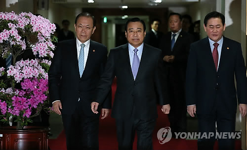 | △ (서울=연합뉴스) 전수영 기자 = 이완구 국무총리는 공무원 기강확립을 위해 연 2회 기관장 평가를 실시하겠다고 밝혔다. 사진은 24일 국무회의에 참석하는 이완구(가운데) 국무총리와 최경환(오른쪽) 경제부총리 겸 기획재정부 장관, 황우여 사회부총리 겸 교육부 장관. |