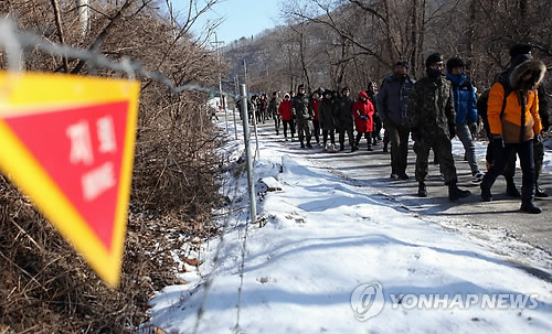 | △ 육군 3사단이 예비역 전우와 현역병 가족을 초청해 지난 1월 17일 마련한 '홈커밍데이' 행사에서 참가자들이 DMZ 생태평화공원을 둘러보고 있다. (육군3사단 제공) |