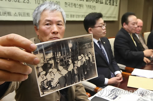 | △ 일본 전범기업 상대 1천명 원고단 손배 청구소송 (서울=연합뉴스) 김주성 기자 = 24일 오전 서울 중구 프레스센터에서 열린 '일본 전범기업 상대 손해배상 청구소송 기자회견'에서 손일석 소송회장(왼쪽)이 강제동원의 실상을 담은 사진자료를 공개하고 있다. |