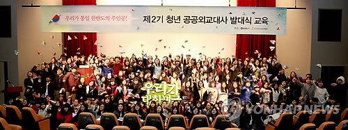 | △ 세계에 한국 알리는 '공공외교 대사' 발대식 (서울=연합뉴스) 강성철 기자 = 24일 서울 용산구 국립중앙박물관에서 열린 '청년 공공외교 대사' 발대식에 참가한 청소년 150여 명이 무대에서 대한민국을 바로 알리기 위한 자신들의 다짐을 적은 종이비행기를 날리며 "우리가 대한민국"이라고 힘껏 외치고 있다. |