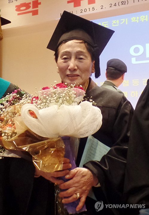 | △ 84세에 학사모 쓴 김정옥 할머니 (광주=연합뉴스) 24일 광주 남부대학교에서 열린 전기 학위수여식에서 김정옥(84)씨가 명예 사회학 학사 증서를 받고 사진을 찍고 있다. 젊었을때 어려운 가정 형편때문에 학업을 포기한 김씨는 2011년 학교 측의 배려로 비정규의 청강생 신분으로 강의를 들었다. (남부대 제공) |