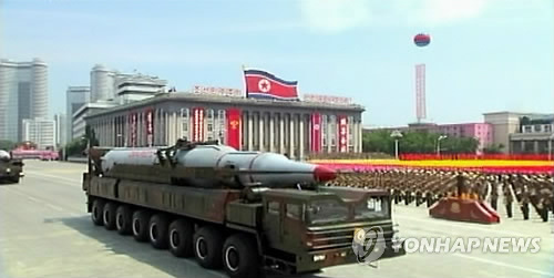 | △ 북한이 현재의 핵개발 추세대로 간다면 2020년까지 최대 100개에 달하는 핵무기를 제조할 수 있다는 분석이 제기됐다. 특히 미국 본토까지 다다를 수 있는 이동식 대륙간탄도미사일(ICBM)인 KN-08을 20∼30개 확보할 수 있을 것으로 전망됐다. 지난 2013년 평양 김일성광장에서 진행한 열병식 중 등장한 대륙간탄도미사일(ICBM) KN-08 (연합뉴스 자료사진) |