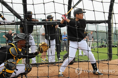 (브래든턴<미국 플로리다주>=연합뉴스) 장현구 특파원 = '해적 군단'인 미국프로야구(MLB) 피츠버그 파이리츠의 일원이 된 내야수 강정호(28)가 투수를 상대로 처음으로 방망이를 돌렸다.