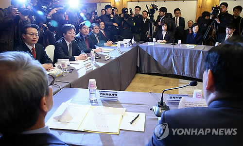 | △ 제1차 당정청 정책조정협의회 (서울=연합뉴스) 진성철 기자 = 새누리당 유승민 원내대표, 최경환 경제부총리, 황우여 사회부총리, 현정택 청와대 정책조정수석 등이 25일 국회 사랑재에서 제1회 당정청 정책조정협의회를 갖고 있다. |
