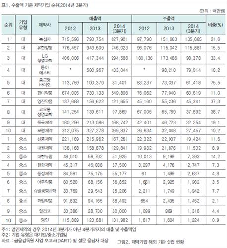 이상은 연구원은 "제약기업들이 해외 진출에 많은 관심을 갖고 있고 해외 수익 역시 매년 성장세를 보이고 있으나 이러한 움직임이 대기업에 집중돼 있어 중소기업에서의 수출 비중은 아직 높지 않다"며 "자금력이나 연구개발(R&D) 투자 여력 차이 등에 기인한 것"이라고 분석했다.
