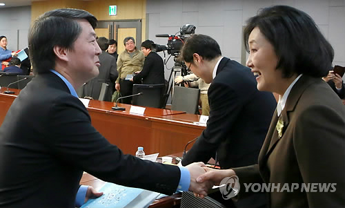| △ 안철수·박영선 인사 (서울=연합뉴스) 백승렬 기자 = 새정치민주연합 안철수·박영선 의원이 25일 국회에서 열린 `박영선·안철수가 말하는 경제성장을 위한 공정한 시장경쟁 좌담회'에서 인사하고 있다. |