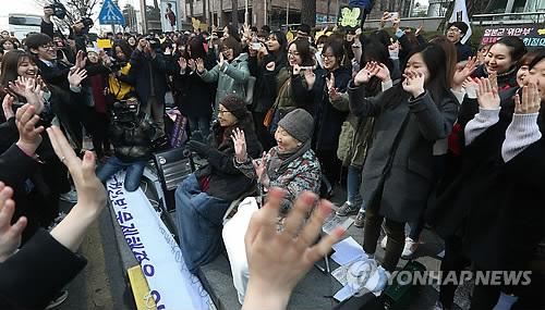 | △ 평화나비 서포터즈에 둘러싸인 할머니 (서울=연합뉴스) 이지은 기자 = 25일 오후 서울 종로구 주한일본대사관 앞에서 열린 제1167차 일본군 위안부 문제해결을 위한 정기 수요집회에서 평화나비 서포터즈 학생들이 김복동(왼쪽), 길원옥 할머니와 함께 노래를 부르며 율동을 하고 있다. 2015.2.25 jieunlee@yna.co.kr |