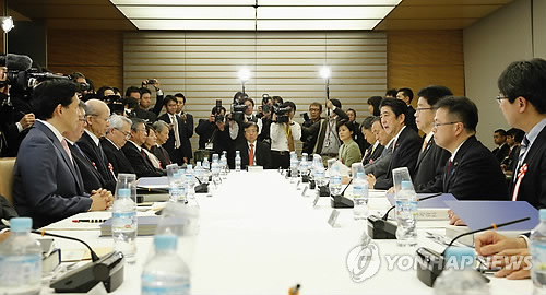 | △ 전후 70주년 '아베 담화' 논의 개시 (도쿄 교도=연합뉴스) 아베 신조(安倍晋三) 일본 총리가 전후(戰後) 70주년을 맞아 오는 여름 발표할 이른바 '아베 담화'에 대한 전문가 논의가 25일 시작했다. 학자, 재계인사, 언론인 등 16명으로 구성된 '20세기를 돌아보고 21세기의 세계 질서와 일본의 역할을 구상하기 위한 유식자 간담회'(이하 간담회)가 이날 도쿄 총리 관저에서 아베 총리와 스가 요시히데(菅義偉) 관방장관 등이 참석한 가운데 첫 회의를 개최하는 모습. 총리 자문기구인 간담회는 아베 담화의 초안 작업을 맡는다. 2015.2.25 jhcho@yna.co.kr |
