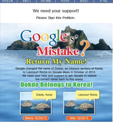 (서울=연합뉴스) 왕길환 기자 = "구글은 구글 지도에서 한국의 고유 영토인 '독도'(Dokdo)의 이름을 '리앙쿠르 록스(Liancourt Rocks)'로 변경했습니다. 복원을 요청합니다."