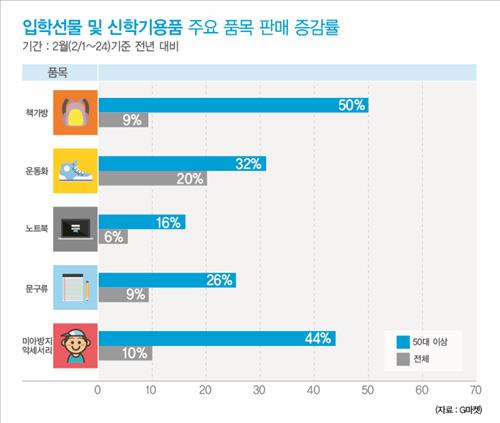 대표적인 초등학교 입학선물인 책가방은 50대 이상 소비자의 구매량이 지난해 같은 기간보다 50% 늘었다. 이 기간 전체 책가방 판매는 9% 신장에 그쳤다.