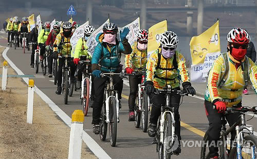 | △ '자전거 안전 에티켓 꼭 지키세요' (서울=연합뉴스) 김주성 기자 = 녹색자전거봉사단연합 회원들이 25일 오전 서울 송파구 한강시민공원 잠실지구에서 자전거안전문화 캠페인을 벌이고 있다. 이날 참가자들은 헬멧 착용, 안전거리 유지 등 '안전다짐 약속'을 발표하는 새해 시륜제를 연 뒤 총 33㎞를 달리며 캠페인을 벌였다. 2015.2.25 utzza@yna.co.kr |