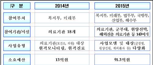 (서울=연합뉴스) 김병규 기자 = 정부가 작년부터 시범적으로 실시하고 있는 원격 의료의 참가 의료기관 수를 늘리고 적용 대상과 방식을 다양화하는 등 서비스를 대폭 확대하기로 했다.