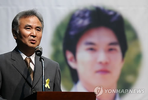 | △ 세월호 침몰 사고 당시 학생들을 구조하다가 숨진 고(故) 남윤철 안산 단원고 교사의 아버지 남수현씨가 지난해 7월 서울 서대문구 디지털서울문화예술대에서 열린 아들의 명예졸업장 추서 및 장학기금 전달식에서 인사말을 하는 모습. 뒤에는 고인의 생전 사진. (연합뉴스 자료사진) |