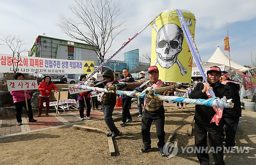 | △ 원전 재가동 반대하는 인근 주민 (경주=연합뉴스) 김준범 기자 = 27일 오후 경북 경주시 월성원전 홍보관 앞에서 원전 인근 주민들이 월성 1호기 가동에 반대하는 내용의 퍼포먼스를 하고 있다. 앞서 원자력안전위원회는 월성 1호기 운전을 2022년까지 허가했다. 2015.2.27 psykims@yna.co.kr |