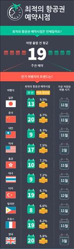 지역별로 싸게 살 수 있는 예약시점을 보면 작년 한국인이 가장 많이 찾은 중국은 출국 20주전(8.7%↓)이었고, 일본 13주전(9.5%↓), 홍콩 10주전(7%↓), 타이베이 9주전(8%↓), 필리핀 8주전(6.6%↓) 등이다.
