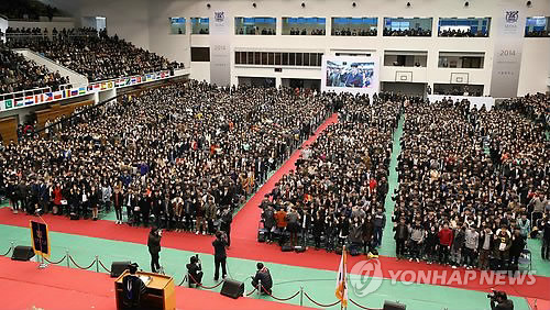 | △ 입학선서하는 서울대 신입생들 (서울=연합뉴스) 한종찬 기자 = 3일 오전 서울 관악구 서울대학교 종합체육관에서 열린 2014학년도 서울대학교 입학식에서 입학생들이 선서를 하고 있다. 이날 입학식에는 학사과정 3천379명, 석·박사과정 대학원생 3천283명 등 신입생 6천662명과 부모, 대학 관계자 등이 참석했다. |