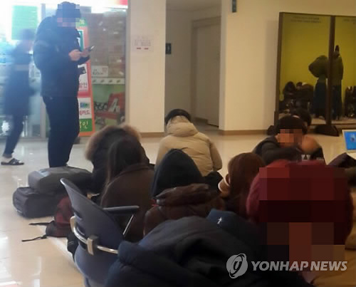 | △ 기숙사 등록에 밤샘대기 (용인=연합뉴스) 한국외대 글로벌캠퍼스가 2일 개강에 맞춰 기숙사 미등록 객실에 대해 선착순 배정을 실시했다. 이에 기숙사 입사를 원하는 학생들이 이틀이나 하루 전부터 밤을 새우고 대기하는 등 진풍경이 연출됐다. 사진은 지난 1일 오후 학생들이 교내 건물 안에서 기숙사 입사 수속을 위해 대기하고 있는 모습. 2015.3.2 <<학생 제공>> you@yna.co.kr |