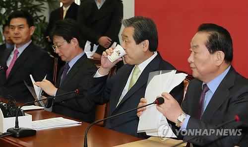 | △ 새누리당 최고위원회의 (서울=연합뉴스) 진성철 기자 = 새누리당 서청원 최고위원(오른쪽 부터), 김무성 대표, 유승민 원내대표, 김태호 최고위원이 2일 국회에서 최고위원회의를 준비하고 있다. |