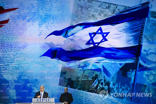| △ 제 갈 길 가는 오바마-네타냐후 (AP=연합뉴스) 베냐민 네타냐후 이스라엘 총리가 2일(현지시간) 미국 워싱턴DC에서 열린 친(親)이스라엘 유대계 로비단체 '미국·이스라엘 공공정책위원회'(AIPAC) 연례총회에서 연설하고 있다. 네타냐후 총리는 이날 연설에서 미 공화당 존 베이너 하원의장 초청 상·하원합동연설은 버락 오바마 미 대통령을 무시한다는 것을 보여주려는 의도가 결코 아니라고 말하면서도 "아직 이란의 핵개발을 피할 수 있는 시간이 있다. 이란 핵무기가 이스라엘의 생존을 위협하고 있다"며 미 주도의 이란 핵 협상을 비판했다. 이런 가운데 백악관은 오바마 대통령이 이스라엘 총선이 얼마 남지 않았다는 이유로 네타냐후 총리와 회동하지 않을 것이라는 점을 재차 확인했다. |