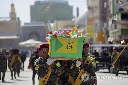 | △ (AP=연합뉴스) 이라크 헤즈볼라 대원들이 2일(현지시간) 나자프에서 이슬람 극단주의 무장단체 '이슬람국가'(IS)와의 교전 중 사망한 동료의 장례를 치르고 있다. 이날 이라크군은 시아파 민병대, 수니파 부족 무장조직과 합동으로 IS가 장악한 티크리트와 일대 주요 도시를 탈환하는 작전을 개시해 교전을 벌였다. Iraqi Hezbollah fighters carry the coffin of their comrade, Ali Mansour, who his family says was killed in Tikrit fighting Islamic militants, during his funeral procession, in the Shiite holy city of Najaf, 100 miles (160 kilometers) south of Baghdad, Iraq, Monday, March 2, 2015. Backed by allied Shiite and Sunni fighters, Iraqi security forces on Monday began a large-scale military operation to recapture Saddam Hussein's hometown from the Islamic State extremist group, state TV said, a major step in a campaign to reclaim a large swath of territory in northern Iraq controlled by the militants. (AP Photo/Jaber al-Helo) |