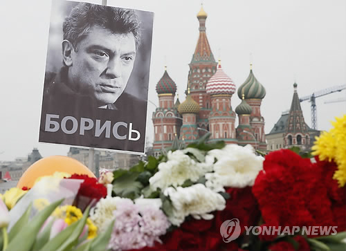 | △ (EPA=연합뉴스) 2일(현지시간) 러시아 야권지도자 보리스 넴초프(55)의 초상 아래로 그를 추모하는 꽃들이 그가 지난달 27일 피살된 모스크바 중심부에 놓여있다. |