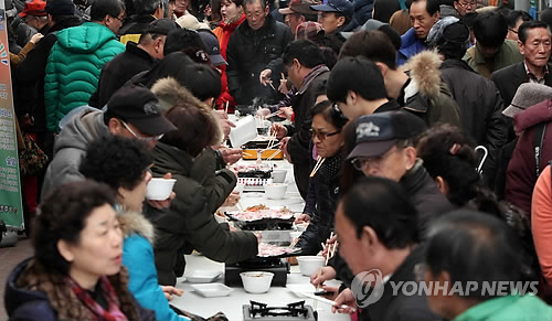 | △ 500인분 삼겹살 무료시식행사 (청주=연합뉴스) 김형우 기자 = 삼겹살데이로 불리는 3월 3일 청주시 상당구 서문동 서문시장에서 청주삼겹살거리 상인회가 마련한 500인분 삼겹살 무료시식 행사에 참가한 시민들이 삼겹살을 구워 먹고있다. 2015. 3. 3 vodcast@yna.co.kr |