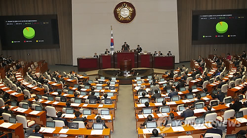 | △ '부정청탁 및 금품 등 수수의 금지에 관한 법률안' 통과 (서울=연합뉴스) 이상학 기자 = 3일 오후 국회에서 열린 제331회 국회(임시회) 제8차 본회의에서 '부정청탁 및 금품 등 수수의 금지에 관한 법률안'이 통과되고 있다. |