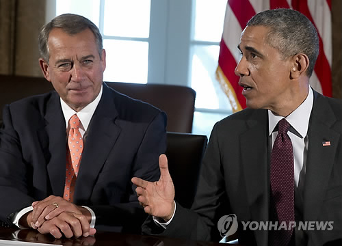 | △ 1월13일 백악관에서 열린 버락 오바마 대통령과 의회 지도부 회동 당시의 오바마 대통령과 공화당 소속 존 베이너(오하이오) 하원의장 모습. |