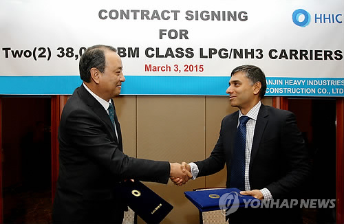 | △ 한진중공업 영도조선소 가스운반선 수주 (부산=연합뉴스) 한진중공업 영도조선는 동남아 선주와 가스운반선 2척에 대한 수주계약을 체결했다고 4일 밝혔다. 2015.3.4 joseph@yna.co.kr |