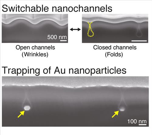 | △ 주름(Wrinkle, open channel)과 접힘(folding, closed channel)을 이용한 개폐식 나노 채널 단면 SEM 사진(위) 나노 접힘 구조 속에 포집되어 있는 금 나노입자(노란색 화살표. 아래) |